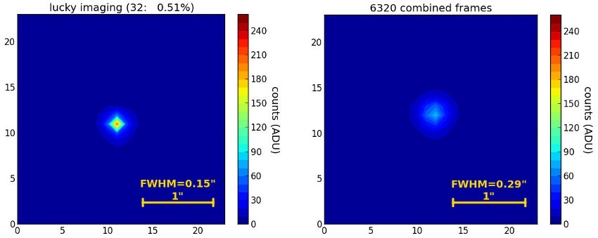 Assessment of the JST250 image quality using lucky-imaging (LI) techniques with the verification camera, in December 2nd 2015. The left panel shows an excellent FWHM of 0.15” as the result of applying LI techniques for a given star, with integration times of 10ms per frame, and aligning and stacking the best 0.5% frames according to their Strehl ratios. The right panel illustrates the combination (no previous alignment) of all the frames acquired during the test, obtaining a fantastic FWHM of 0.29”. The test was performed under excellent seeing conditions, with values as low as 0.39” in that night. This result demonstrates that the JST250+dome system can provide images with PSFs smaller than the seeing value measured by the DIMM monitor.